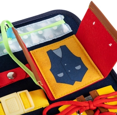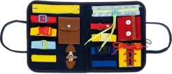 Obsahuje 14 různorodých prvků, mezi které patří zipy, přezky, knoflíky a další, které podporují praktické dovednosti a samostatnost.