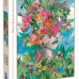 Koláž květin, ptáků a zvířat s kontrastním portrétem působí moderně a dekorativně – po podlepení z puzzle vznikne originální obraz.