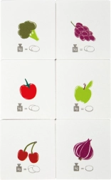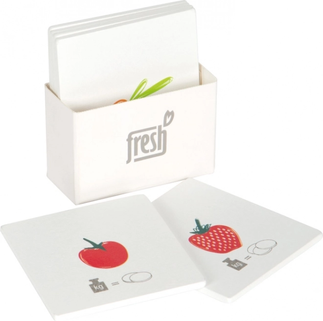 Šest oboustranných karet s ovocem a zeleninou a symboly mincí pomáhá dětem chápat hodnotu a porovnávat ceny zábavnou formou.