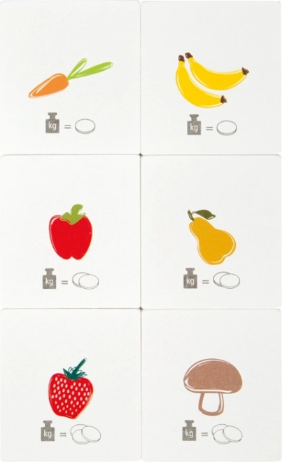 Součástí balení je šest oboustranných karet s obrázky potravin a mincemi, které dětem názorně ukazují, že více mincí znamená vyšší cenu za kilogram. Hra tak přirozeně rozvíjí základní matematické dovednosti, jemnou motoriku a koordinaci oko–ruka. Robustní provedení ze dřeva a plastu zaručuje dlouhou životnost a bezpečné používání.