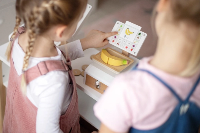Stylová dětská váha z kvalitního dřeva a akrylátu promění každý obchod či kuchyňku v malý supermarket. Díky funkčnímu pružinovému mechanismu, pohyblivému ukazateli hmotnosti a extra velké vážicí misce si děti užijí realistickou hru a zároveň se naučí počítání, porovnávání hmotnosti i základy měření. Součástí je 6 oboustranných karet s ovocem a zeleninou s mincemi pro snadné pochopení cen.
