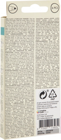 Objevte kreativitu s touto sadou šesti markerů určených na sklo a porcelán. Nabízí živé barvy, výborné krytí a snadnou aplikaci pro profesionální výsledek. Hotové motivy jsou odolné a lze je mýt v myčce, ideální pro zdobení hrnků, misek i sklenic.