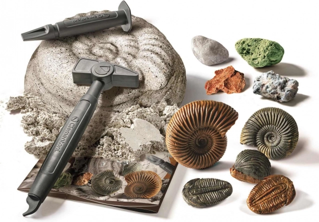 Vraťte se v čase a staňte se malým paleontologem. Kompaktní vykopávací blok ukrývá věrné napodobeniny pravěkých fosilií, jako jsou amoniti či trilobiti, a také drobné minerály. Odštípávejte sádrový „kámen“ pomocí odolného plastového kladívka a dlátka a sledujte, jak se před vašima očima objevují poklady dávných věků.