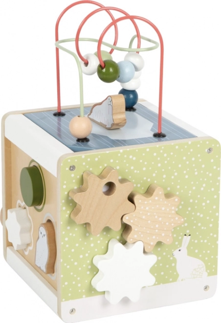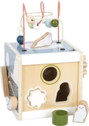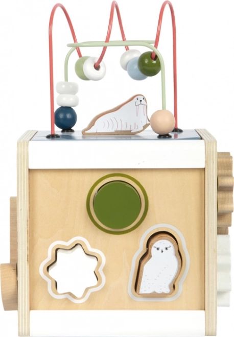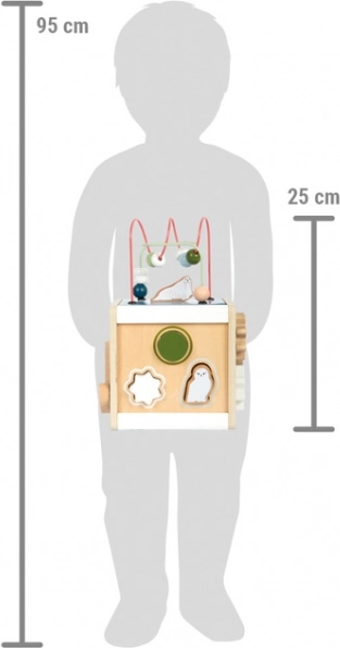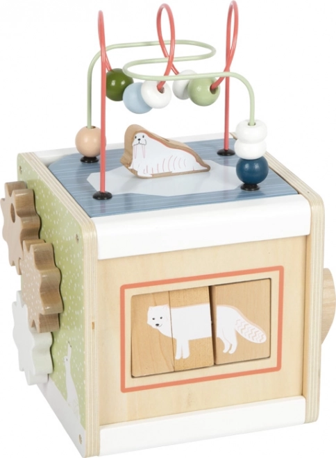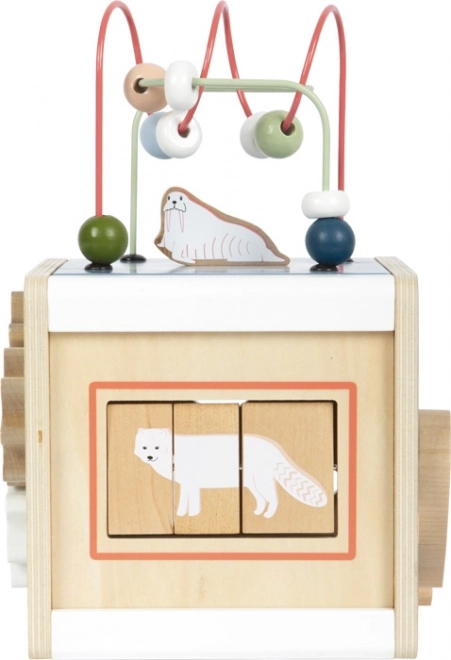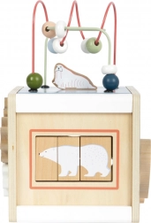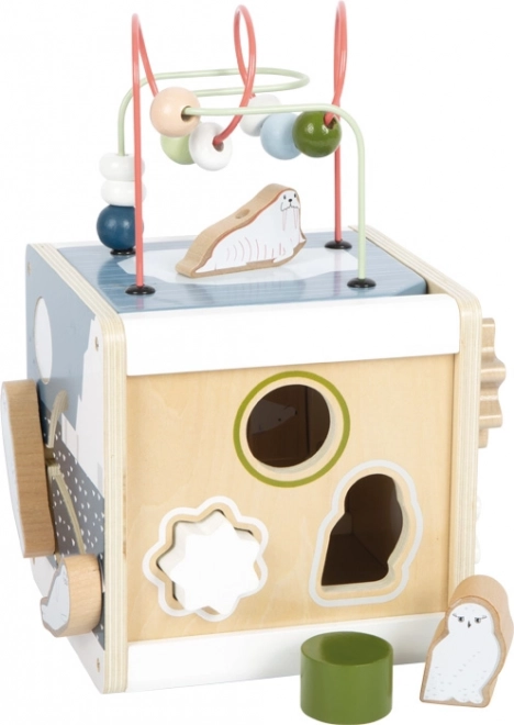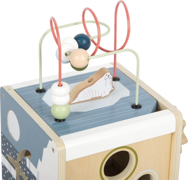 Dopřejte dětem nekonečnou zábavu a učení s dřevěnou motorickou kostkou SMALL FOOT ARCTIC z 100% FSC dřeva. Na pěti stranách nabízí korálková bludiště, vkládání tvarů, posuvné labyrinty, ozubená kolečka i otáčecí prvky, které podporují jemnou motoriku, logiku a rozpoznávání barev a tvarů. Odnímatelné víko usnadní ukládání dílků, zaoblené hrany zajistí bezpečnou hru a moderní arktický design krásně zapadne do dětského pokoje.