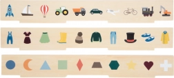 Tato kvalitní dřevěná vkládačka přináší dětem zábavné učení formou hry. Tři oboustranné panely nabízejí jasné ilustrace a jednoduše srozumitelné kategorie, díky nimž si děti procvičí třídění, porovnávání a přiřazování obrázků do správných slotů. Robustní box s praktickými přihrádkami udrží všechny dílky pohromadě.