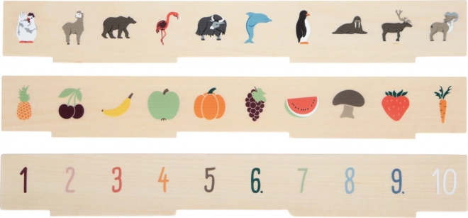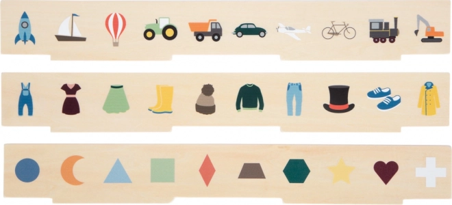 Chytrá dřevěná hračka pro děti od 3 let, která kombinuje třídění, vkládání a učení slov. Obsahuje tři oboustranné panely a 60 obrázkových žetonů na témata doprava, zvířata, čísla, tvary, oblečení, ovoce a zelenina. Při hře si děti rozvíjejí jemnou motoriku, poznávání barev a tvarů a přirozeně si rozšiřují slovní zásobu. Bezpečné uložení zajišťuje dřevěný box s 10 přihrádkami a gumičkovými západkami – ideální i na cesty.