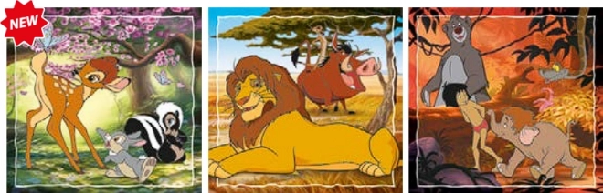 Sada obsahuje 3 samostatná puzzle, každé o 48 dílcích, s klasickými motivy DISNEY – zábava a variabilita pro každé odpoledne.
