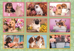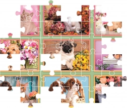 Koláž plná štěňátek (a koťátek) s květinami nadchne milovníky zvířat a ozdobí každý dětský pokoj po složení.