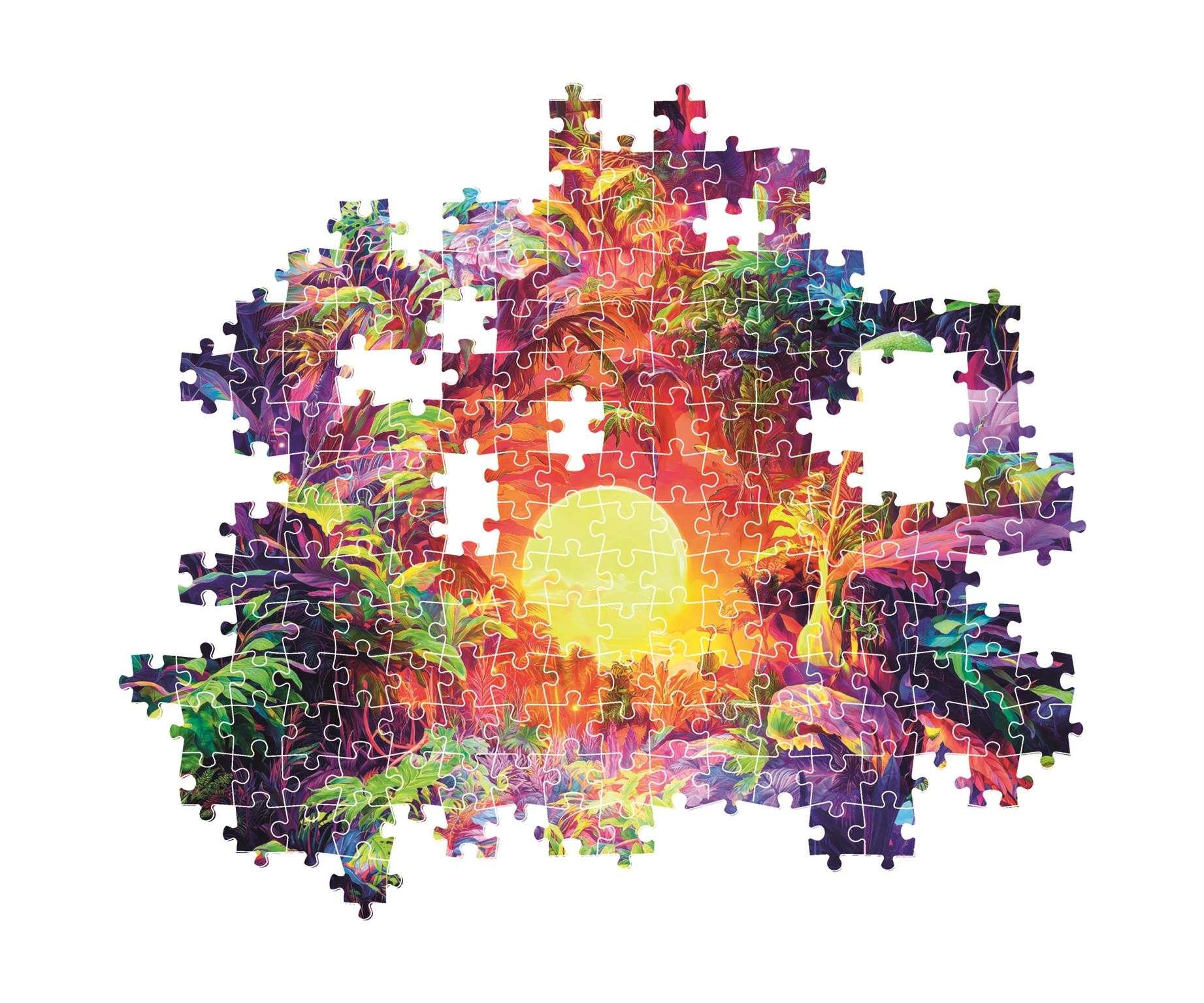 Vstupte do zářivé kompozice s motivem psychedelického svítání v tropické džungli. Kompaktní balení šetří místo i životní prostředí, přesto nabízí plnohodnotný zážitek ze skládání. Kvalitní potisk a přesná ražba zaručují hladké napojování dílků a odolnost proti opotřebení.