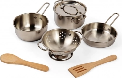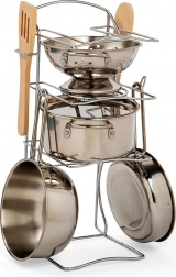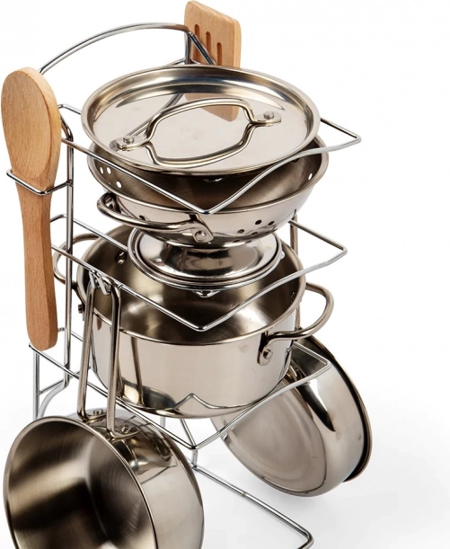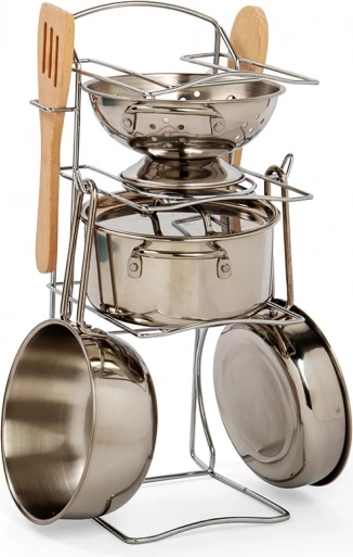 S touto 8dílnou sadou děti získají příležitost a nástroje pro pretenzní vaření. Obsahuje realisticky vypadající kovové nádobí, jako je cedník, pánev, dva hrnce s poklicí a také dřevěnou vařečku s obracečkou na praktickém stojanu. Ideální pro podporu kreativity, rozvoj řeči a sociálních dovedností.