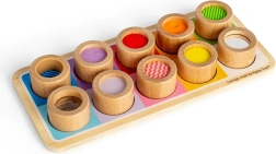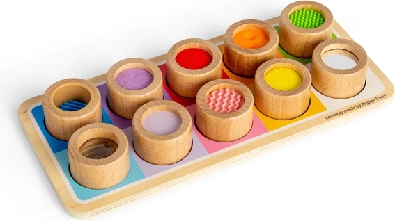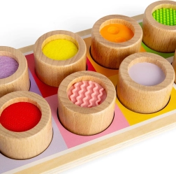 Tato úžasná senzorická deska je dokonalým způsobem, jak děti seznámit s různými texturami a barvami. Obsahuje dřevěnou desku s barevnými otvory a jedenáct vkládacích dílků, z nichž každý má jedinečnou povrchovou úpravu, od vroubkovaného silikonu po jemnou plsť. Tato hračka nejen že pomůže rozlišovat různé textury, ale také podporuje koordinaci rukou a očí.