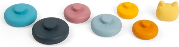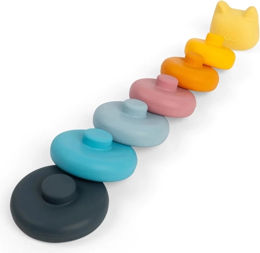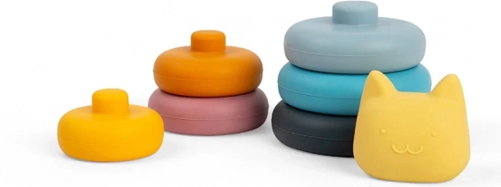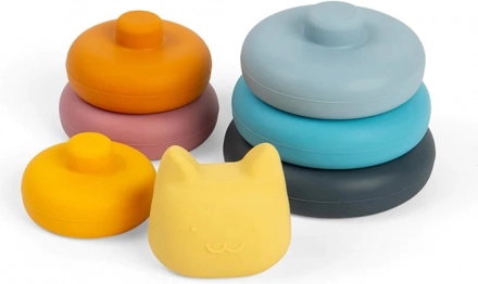 Hračka se skládá z šesti jemně barevných kroužků a kočičí hlavy na vrcholu. Hladký silikon je příjemný na dotek a zároveň podporuje senzorický rozvoj dětí. Skládací hračky pomáhají rozvíjet jemnou motoriku a učit se barvy.