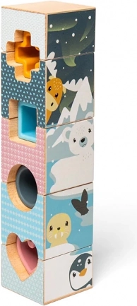 Arktická věž je unikátní hračka, která nabízí kombinaci dvou materiálů – FSC® certifikované dřevo a 100% potravinářský silikon. Dřevěné dílky ukazují krásné ilustrace arktických zvířat, jako jsou lední medvědi a tučňáci, zatímco silikonové dílky rozvíjejí smysly. Tato inovativní konstrukce učí děti různorodosti textur – měkkých, hladkých a tvrdých povrchů.