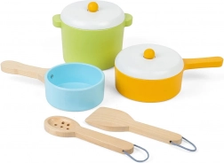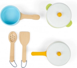 Obsahuje 3 hrnce, 2 poklice a 2 kuchyňské náčiní, vše v pastelových barvách, které dokonale napodobují skutečné nádobí.