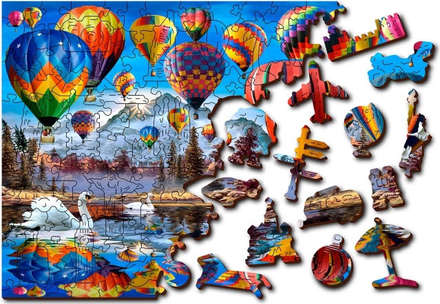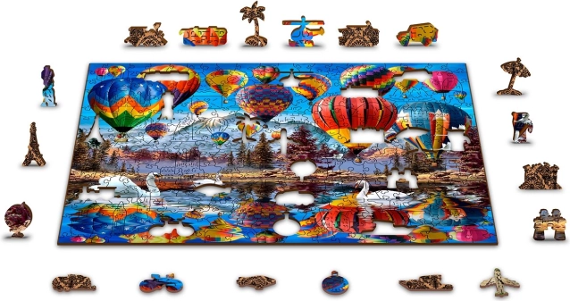 Objevte kouzlo skládání s dřevěným oboustranným puzzle, které přináší vyšší obtížnost, unikátně tvarované dílky a ekologické balení bez plastu. Laserem přesně vyřezávané dílky ze silné HDF desky zaručují hladké hrany, perfektní dosednutí a dlouhou životnost. Užijte si zábavu 2v1 – z lícové strany krásný motiv s horkovzdušnými balóny nad krajinou, z rubu pak vzor pro skládání podle tvaru.