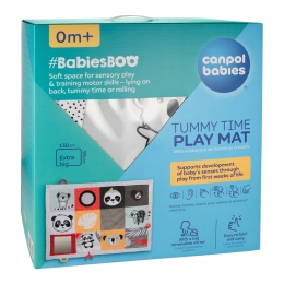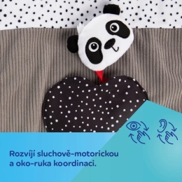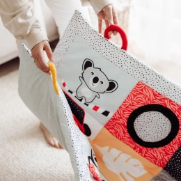 Kontrastní vzory, šustící a pískací prvky a zrcátko rozvíjejí zrak, sluch i hmat. Dítě motivují k objevování a delšímu času na bříšku.