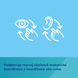 Plyšové postavičky se šustícími, pískajícími a chrasticími prvky podporují rozvoj zraku, sluchu a koordinace oko–ruka.