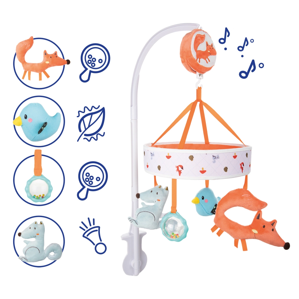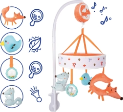 Pestrobarevný kolotoč nad postýlku s roztomilými plyšovými zvířátky z kolekce FOX přitahuje pozornost miminka a vytváří příjemnou uspávací rutinu. Ručně natahovaný strojek přehrává klidné melodie, které dítě uklidní a podpoří snadné usínání – bez potřeby baterií.
