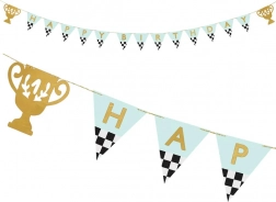 Tento krásný papírový baner s motivem 'Happy Birthday' a zlatými trofejemi je ideální dekorací pro každou narozeninovou oslavu. Snadno se zavěšuje díky lehké konstrukci, a tak rychle a snadno vytvoříte veselou atmosféru. Ideální pro každou věkovou skupinu i tématickou párty!