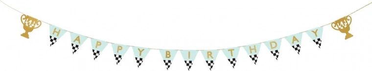 Baner je ve světlých modrých a černobílo kostkovaných vzorech, které spolu s trofeji vytvářejí sportovně laděný vzhled. Je vhodný nejen pro děti, ale i pro dospělé oslavy.