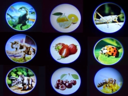 Tři výměnné disky s 8 snímky každý pokrývají oblíbené motivy: dinosauři, hmyz a ovoce. Děti tak mají stále co objevovat.