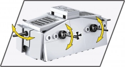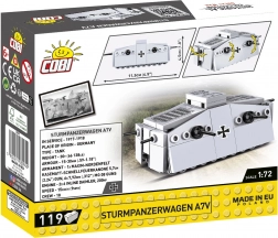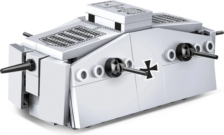 Sturmpanzerwagen A7V byl první německý tank nasazený na konci první světové války. Tento ikonický obrněnec s posádkou až 18 vojáků nesl 57mm kanón Nordfeld a šest kulometů MG 08. Model od COBI v měřítku 1:72 o délce cca 11,5 cm zachovává typické rysy originálu a zaujme precizními potisky křížů, mřížek a poklopů.
