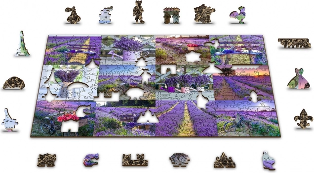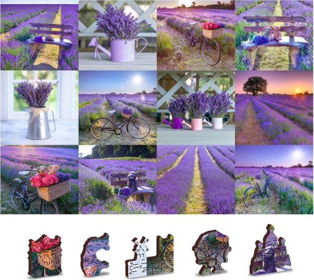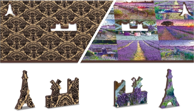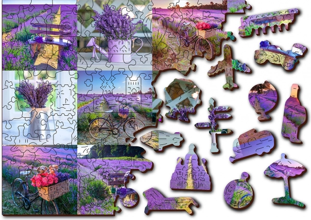 Puzzle je oboustranné, umožňuje skládání podle levandulového motivu nebo vzoru na rubové straně.