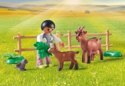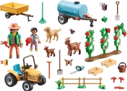 Sada obsahuje: dvě figurky Playmobil, psa, dvě kozy, traktor s přívěsem, cisterna na vodu a množství dalších doplňků, které přidávají na realističnosti příběhů.