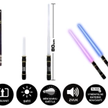 Meč má délku 80 cm a snadno ho složíte pro přenášení či uložení. Integrované senzory zajišťují zvuky při pohybu a také zvuk při zásahu cíle. Napájení zajišťují 3× AAA baterie, které jsou již součástí balení – můžete začít hrát hned po rozbalení.