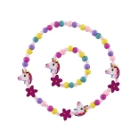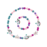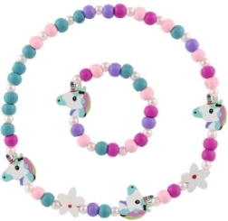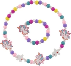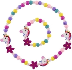 Tato hravá sada dětského šperku – náhrdelník a náramek – okouzlí veselými barvami, korálky a přívěsky s motivem jednorožců a květin. Kombinace dřeva a plastu je lehká, příjemná na dotek a vhodná pro každodenní nošení.