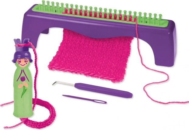 - Kompletní výbava: pletací panenka, pletací stůl, háček, plastová jehlice a příze