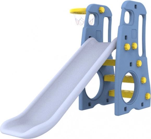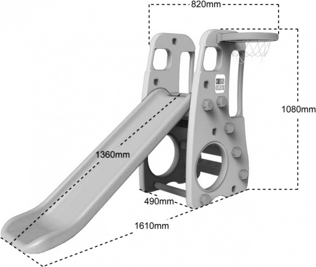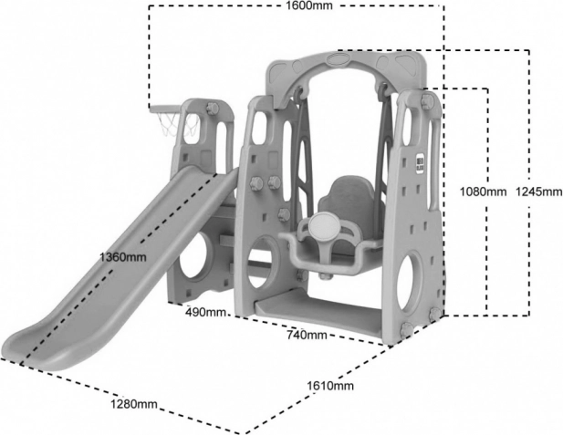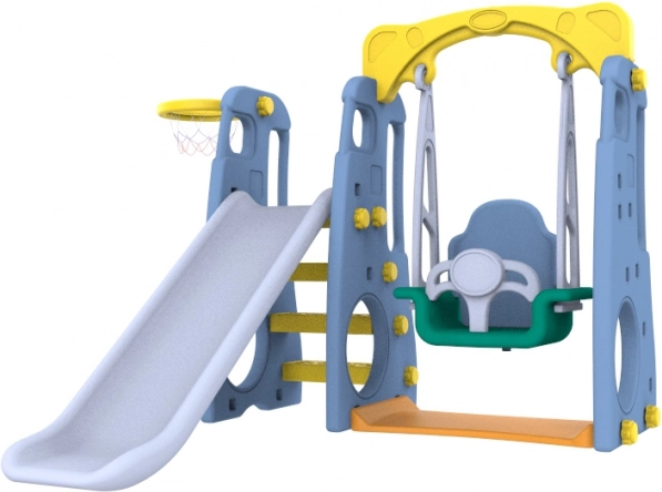 Tento multifunkční dětský set kombinuje dlouhou skluzavku, širokou houpačku s vysokým opěradlem a koš na basket v jednom kompaktním řešení. Díky robustnímu materiálu HDPE s dvojitými stěnami je konstrukce mimořádně odolná, zároveň však šetrná a příjemná na dotek.