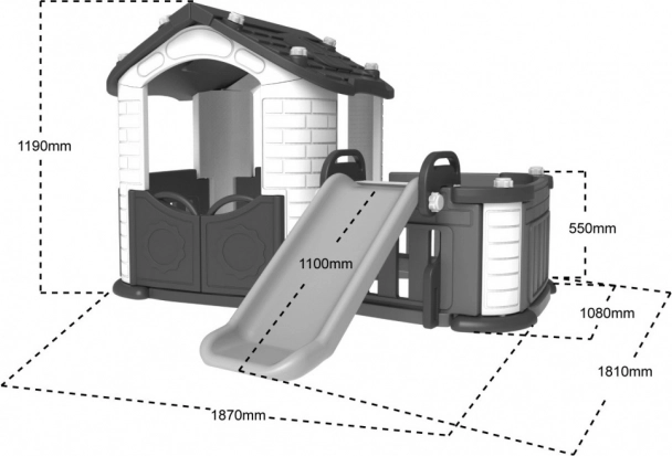 Tento multifunkční zahradní domeček 3v1 je ideální pro aktivní i kreativní hraní na zahradě. Odolná konstrukce z HDPE (vysokohustotní polyetylen) s dvouvrstvými stěnami zajišťuje vysokou pevnost, pružnost a bezpečnost. Díky prostornému interiéru, širokým dveřím a zabudované skluzavce si děti užijí hodiny zábavy i pohybu.