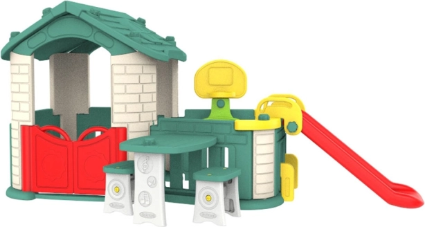 Velký dětský domek 5v1 nabízí nekonečné hodiny imaginativní hry. Součástí je skluzavka, basketbalový koš, zahrádka s plotem a praktický stolek s dvěma židličkami.
