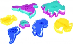 Sada obsahuje vše potřebné: modelovací hmotu v pěti barvách, 7 formiček tvarů kontinentů, 7 razítek s názvy kontinentů a váleček. Stačí rozválet modelínu na tenčí plát a pomocí vykrajovátek vytvořit zvolené světadíly.