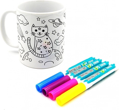 Keramický hrnek na vybarvování s motivem kočky je ideální pro dětskou kreativitu. Umožňuje dětem originálně ozdobit svůj vlastní hrnek pomocí přiložených fixů: