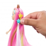 Vlasy v růžových, žlutých a modrých tónech lze česat a zdobit přiloženými sponkami a hřebenem – ideální pro malé stylistky.