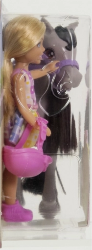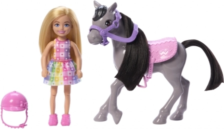 Herní sada Barbie Chelsea na poníkovi přináší dětem spoustu zábavy a fantazie. Chelsea nasadí bezpečnostní růžovou helmu, usedne do pohodlného růžového sedla a díky ohybným kolenům a třmenům se vydá na stylovou projížďku. Šedý poník s fialovou uzdečkou, měkkou hřívou a ocasem je jako stvořený pro péči a něžné hlazení.