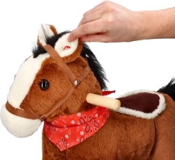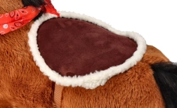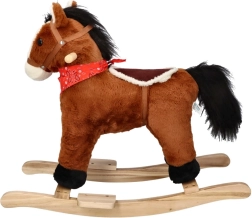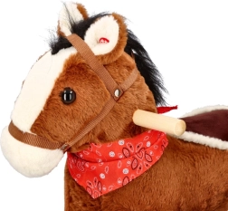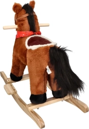 Houpací koník v hnědé barvě s měkkým plyšovým povrchem, sedlem a ozdobným šátkem je ideální společník pro každodenní hraní. Díky pevné dřevěné kolébce se dítě může bezpečně houpat, rozvíjet motoriku a procvičovat koordinaci.