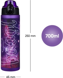 Stylová tritanová láhev na pití s motivem galaxie o objemu 700 ml je ideální do školy, na výlety i sport. Má uzamykatelné víčko, nepropustné těsnění a praktické poutko na nošení. Vyrobena z certifikovaného tritanu bez BPA – bez zápachu a bezpečná pro každodenní použití.
