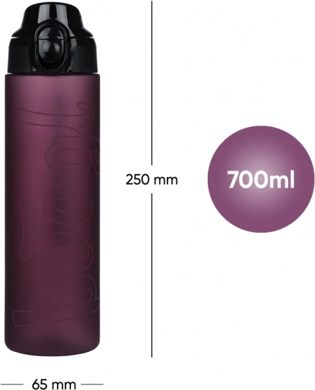 Kapacita 700 ml v kompaktním těle (cca 250 × 65 mm) se vejde do batohu i držáku na láhev. Ideální pro školu i sport.