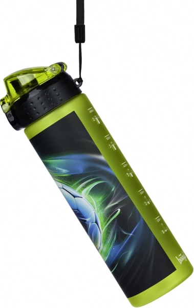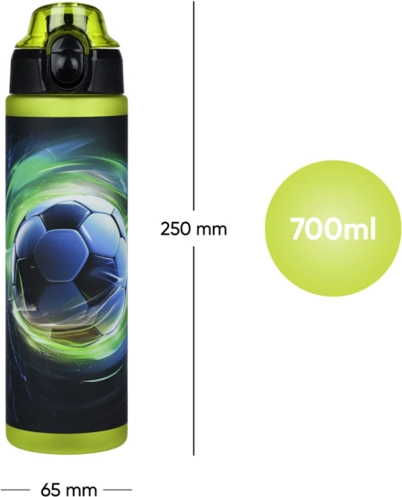 Stylový fotbalový potisk a boční ryska pro kontrolu pitného režimu. Ideální do školy, na trénink i cesty.
