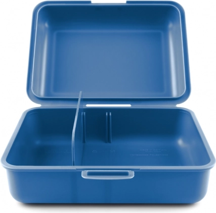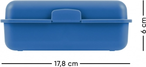 Modrý plastový box má rozměry 17,8 cm x 12,2 cm, díky čemuž je ideální pro pohodlné přenášení a ukládání jídel.
