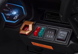 Rodiče ocení bezpečnostní prvky včetně dálkového ovládání 2.4 GHz se třemi rychlostmi a funkcí Stop, dále volný start bez trhání a bezpečnostní pás na pohodlném sedadle z černé eko kůže. Měkká EVA kola tlumí nerovnosti a poskytují dobrou přilnavost.