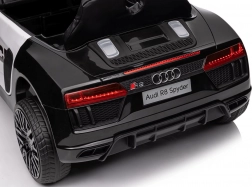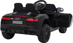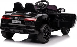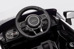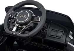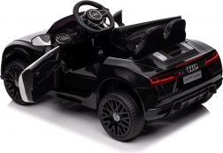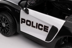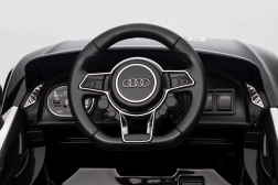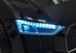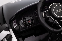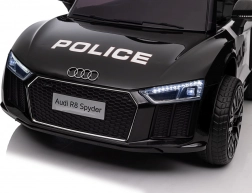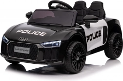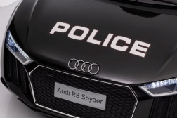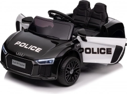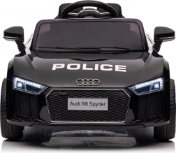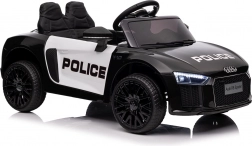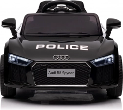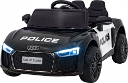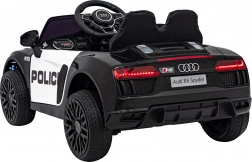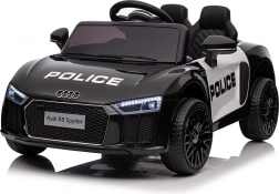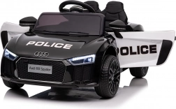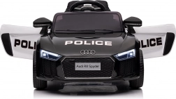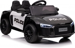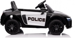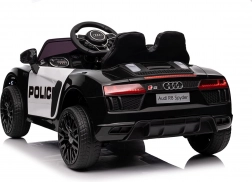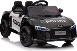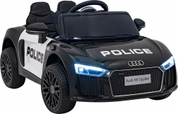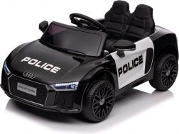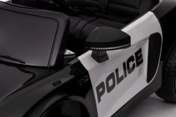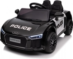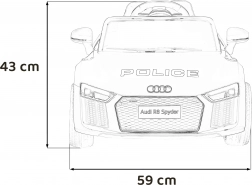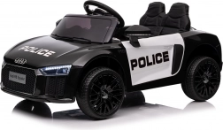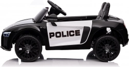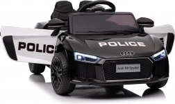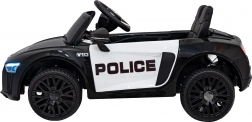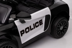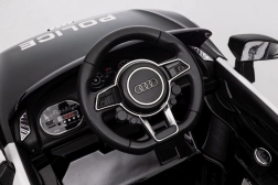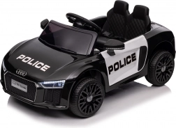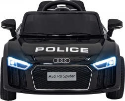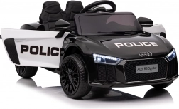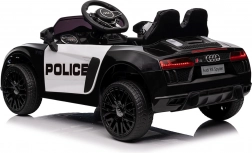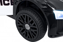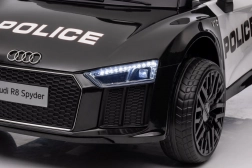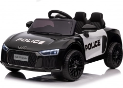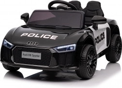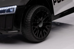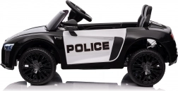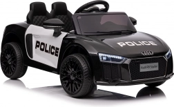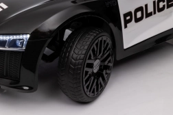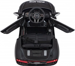 Stylové elektrické policejní autíčko AUDI R8 potěší malé řidiče realistickým vzhledem a skvělou výbavou. Nabízí 2× 35 W motory, dvojitou baterii 2× 6 V/4,5 Ah, dálkový ovladač 2.4G se 3 rychlostmi a bezpečnostním STOP, měkká EVA kola 19 × 7 cm s odpružením vpředu i vzadu, plynulý start, LED světla a zábavný audio panel USB/SD/MP3/AUX. Komfort zajišťuje sedadlo z eko kůže s pásy a otevírací dveře.