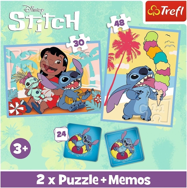 Sada kombinuje dvě samostatné skládačky (30 a 48 dílků) a 24 karet pexesa s veselými obrázky STITCHE a jeho přátel. Silný karton a pohodlně velké dílky usnadňují manipulaci malým dětským ručkám, zatímco živé barvy motivují k opakovanému hraní.