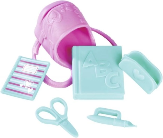 Obsahuje školní potřeby jako je sešit, nůžky, penál, pero a učebnice pro realistickou hru.
