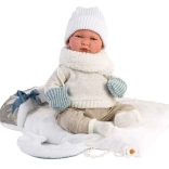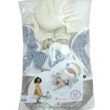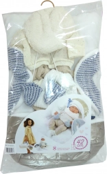 Tento elegantní obleček pro panenku NEW BORN vyniká pečlivým zpracováním a nadčasovým designem. V sadě najdete sladěné pletené a textilní kousky pro každodenní i zimní styling, doplněné o měkou podložku s kapucí a praktickými popruhy, díky nimž lze panenku snadno přenášet.