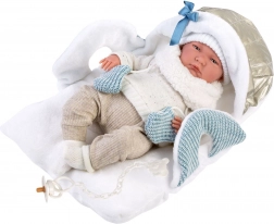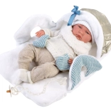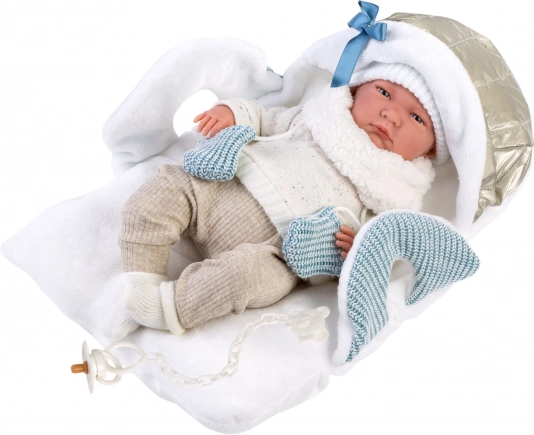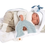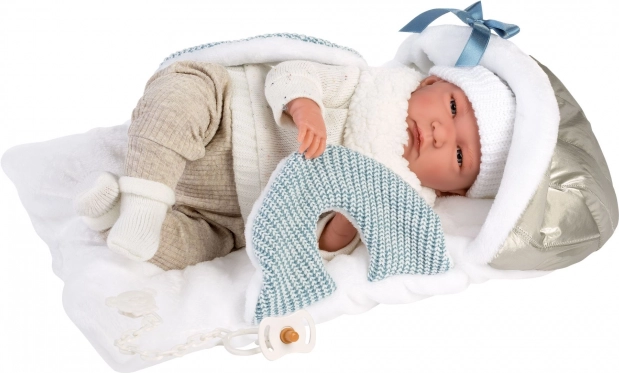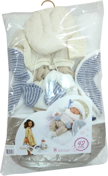 Dopřejte své panence styl a pohodlí s touto 6dílnou sadou oblečení NEW BORN pro panenky 40–42 cm. Ručně vyrobeno ve Španělsku, set zahrnuje měkou podložku s kapucí a popruhy pro přenášení, aby bylo převlékání i cestování s panenkou snadné a zábavné. Kvalitní pletené materiály v jemných neutrálních a modrých tónech podporují kreativní a pečující hru dětí od 3 let.