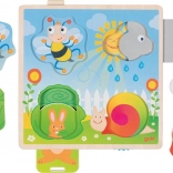 Objevte zábavný svět dřevěné vkládačky s motivem zahrady, která je ideální pro malé děti. Zahrnuje: